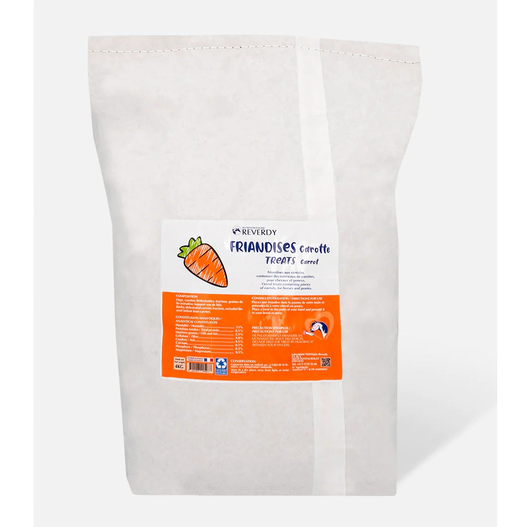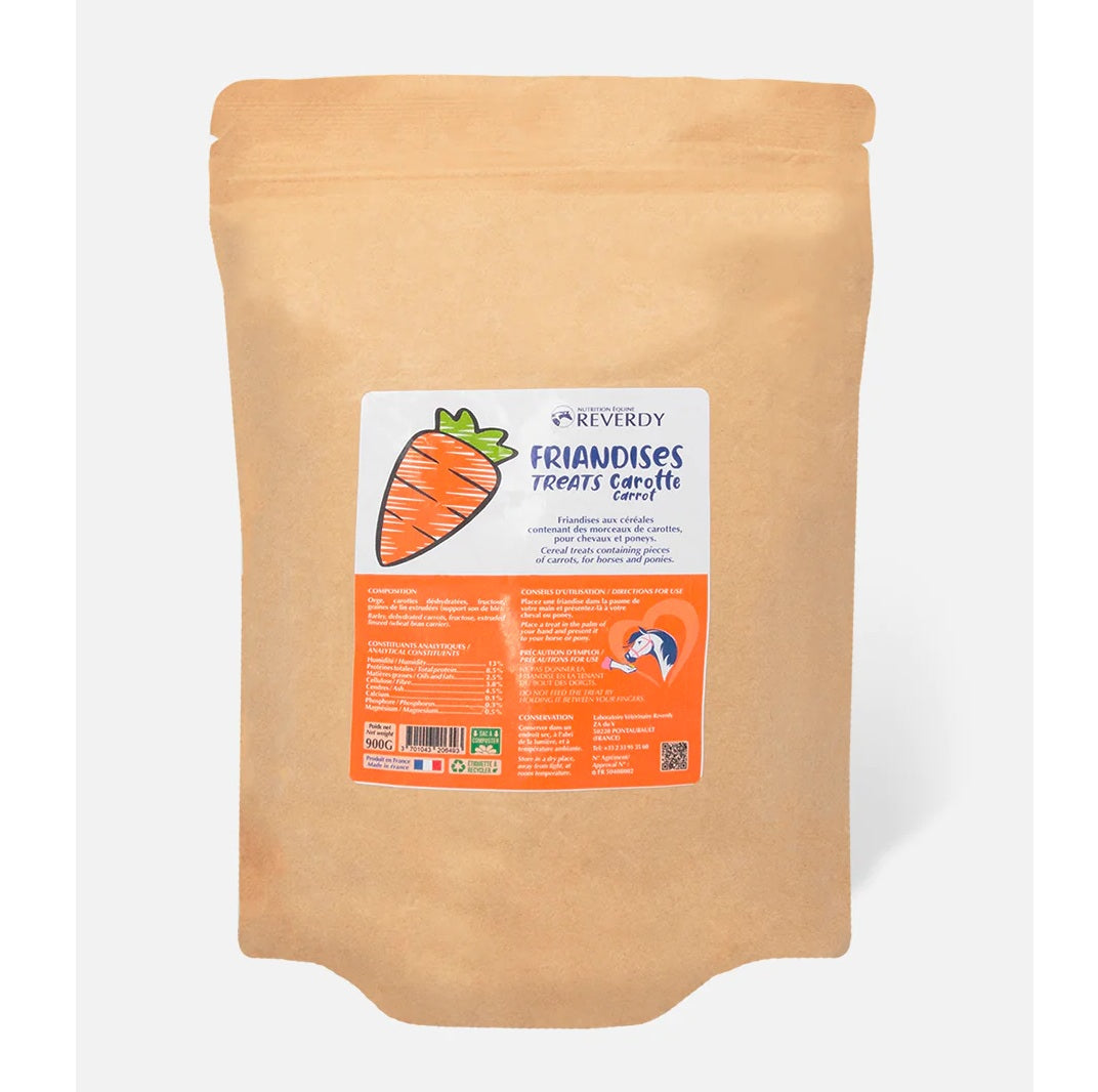 Les Reverdy Treats Carotte sont de délicieuses friandises aux céréales, spécialement formulées pour récompenser votre cheval ou votre poney au quotidien. Leur recette savoureuse contient de véritables morceaux de carotte, très appréciés pour leur goût naturel et gourmand.